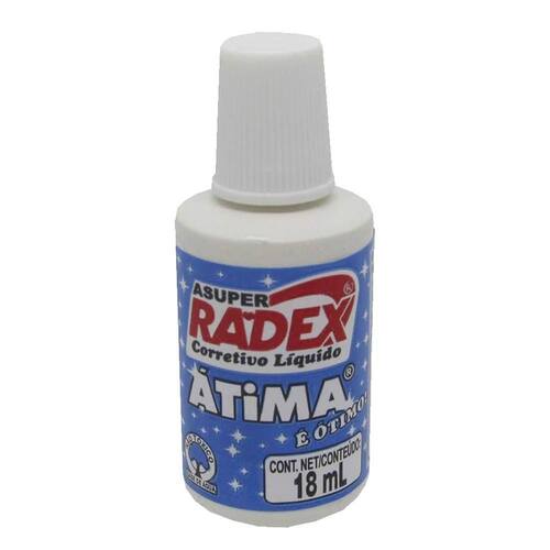 Corretivo Líquido Átima Radex 18ml Descrição- O Corretivo Líquido Átima Radex é fácil de usar e proporciona correções precisas, com o máximo controle e conforto. - Cobre e corrige com precisão textos impressos e tintas esferográficas. - Proporciona trabalho limpo e sem rasuras. - Atóxico e pode ser por crianças no dia a dia. - Não ressaca. - Inodoro. Imagens meramente ilustrativas. Marca: Não Informado Ean: 7897254100401