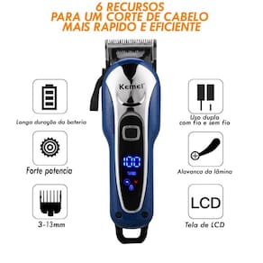 Itens na embalagem: 1 x máquina para cortar cabelo - mod. Km-1995 1 x capa protetora para lâmina 4 x pentes limitadores 3, 6, 10, 13mm 1 x frasco com óleo lubrificante 1 x escova de limpeza 1 x carregado com cabo bivolt