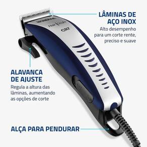 Além dos pentes, o CR-07 acompanha tesoura, pente de barbeiro, escova de limpeza e óleo lubrificante.