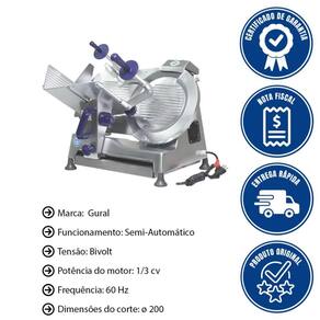 DESCRIÇÃO DO CORTADOR DE FRIOS BIVOLT - Explore a eficiência e conveniência do Cortador de Frios Semi-Automático Gural modelo GLP-300. - Com um motor de 1/3 CV, este equipamento proporciona cortes ágeis e precisos, simplificando o processo de produção. Sua versatilidade bivolt permite adaptação a diferentes ambientes de trabalho. - Com funcionamento semi-automático, otimiza a rotina de corte.