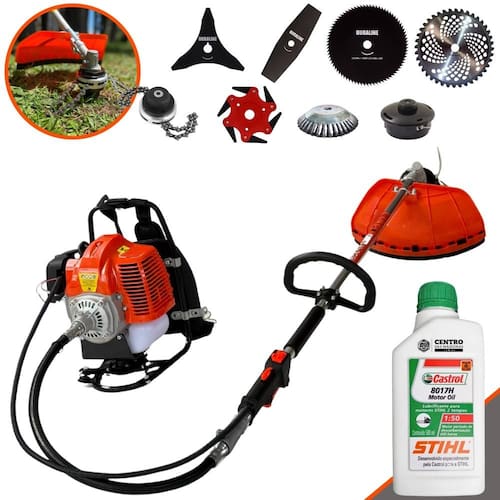 Possui motor 2 tempos á gasolina, de 43Cilindradas, 1,7HP de potência que proporcionam maior performance e economia na operação.Seu conjunto de acessórios inclui kit de ferramentas, cinto de suporte duplo almofadado, carretel de nylon e lâmina de corte 40 Dentes.