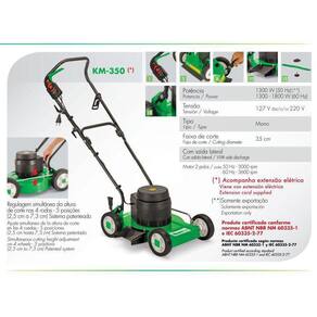 Cortador De Grama Elétrico Monofásico 1800w Trapp Km 350 Características - Equipado com botão trava de segurança que impede o acionamento acidental da máquina, liberando a partida do motor, somente quando pressionado;- Chave elétrica interruptora bipolar, que permite isolação total e independente da posição do plugue na tomada;- Cabo ergonômico para maior conforto do operador e dobrável facilitando o transporte e armazenamento;- Base em chapa de aço de 1,5mm;- Trava para extensão elétrica;- Rodas de polietileno de alta densidade, revestida com pneu PVC;- Motores de indução, monofásicos de dois polos, instalados num compartimento de polietileno de alta densidade para proteção contra descargas elétricas , com partida eletrônica e fusível de proteção;- Extensão com duplo revestimento em PVC, altamente isolante e comprimento de 10 metros. - Saída Lateral;- Lâmina de aço especial, espessura de 2.35mm com têmpera total;- Regulagem de altura em 5 posições que varia de 2,5cm a 7,3cm. Regulagem simultânea da altura de corte nas quatro rodas que permite efetuar o corte do gramado numa única operação e acabamentos nas bordas dos canteiros;- Todas as peças recebem tratamento anticorrosivo e pintura com tinta a pó de poliéster polimerizado em estufa a 230°C, garantindo maior durabilidade e acabamento;- Garantia: 12 meses. Ficha técnica - Potência: 1800W- Tensão V : 220 - Motor: Monofásico- Peso líquido kg : 19,8- Faixa de corte : 35 cm- Recolhedor: Saída lateral- Rotação: 60 Hz - 3600 rpm Aplicação Recomendado para jardins residenciais de até 500m².Ficha técnica- Voltagem: 220v- Tipo de ferramenta: Cortador de grama