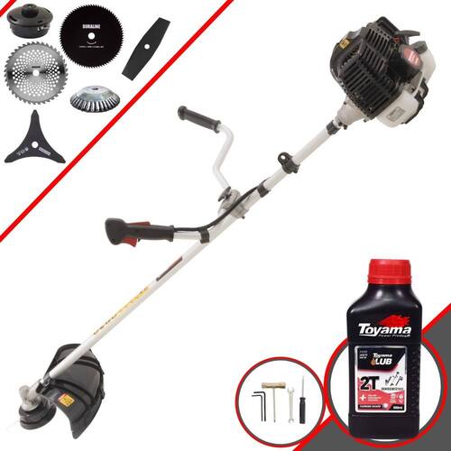 Roçadeira Kawashima KW52LE À Gasolina 2T 52c 2,5HP Com Lâmina 3 Pontas + Faca 2 Pontas 330mm 2,7mm + Faca 40 Dentes 255mm 2mm + Faca 80 Dentes 255mm 1,5mm + Escova Rotativa 38 Cerdas 200mm + Óleo TOYAMA LUB FG50 500ml 2T