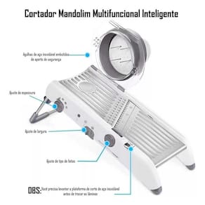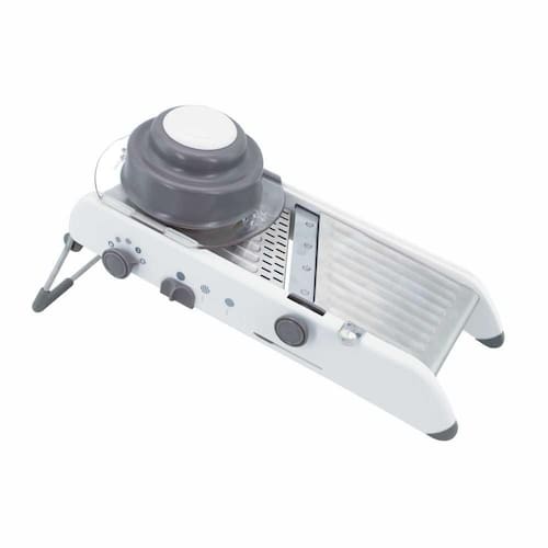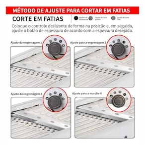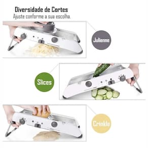 Possui espessura ajustável, de 1 mm a 7,5 milímetros, e o julienne pode ser definido como grosso ou fino. O protetor de mão incluído apresenta dentes longos para fixar nos alimentos e oferecer total segurança. Os pés antiderrapantes e punho elevado lhe permite cortar diretamente sobre tigelas e bowls. Fácil de operar, com sistema de corte totalmente integrado, sem lâminas removíveis Construção robusta Lâminas de aço inoxidável.