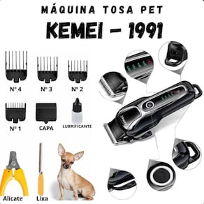 Cortador de pelo kemei km-1991 compacto silencioso Descrição do anúncio: A máquina de tosa pet bivolt kemei km-1991 é ideal para tosar animais de pequeno e médio porte de forma eficaz e segura. Equipada com lâmina de aço inoxidável, possui tela lcd digital para monitorar a bateria e opera silenciosamente, garantindo conforto para o pet. Conteúdo da embalagem: Máquina km-1991 Fonte bivolt 4 pentes guia 3mm, 6mm, 10mm, 13mm Bisnaga com silicone Pente Cortador de unhas Lixa Manual do usuário Características: Sem fio Tensão bivolt Potência de 5w Lâminas de aço inoxidável ajustáveis 0,5 mm a 1,0 mm Motor de alta velocidade Carregamento rápido 3 horas Autonomia de até 120 minutos 4 pentes guia 3mm, 6mm, 10mm, 13mm Especificações: Material: abs de alta qualidade Tela lcd Sistema de corte r-shape Tempo de carregamento: 3 horas Tempo de uso: até 120 minutos Tensão de entrada: 5v Corrente: 1000ma Principais perguntas sobre o produto e respostas: 1 é indicada para pets de médio e grande porte Sim, eficaz para animais de qualquer tamanho. 2 o produto é resistente Sim, feito com materiais de alta qualidade e durabilidade. 3 tempo de carregamento da bateria Aproximadamente 3 horas. Marca: Não Informado Ean: 7905276309822