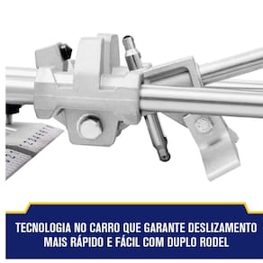 Além disso, este cortador conta com uma série de recursos que o tornam completo e versátil: esquadro ajustável para cortes precisos a 45 e 90, alça integrada para transporte e suporte com travas para o carro. A régua plástica auxilia em cortes menores com praticidade e precisão, enquanto o carrinho de corte com rodelas ajustáveis facilita a manutenção.