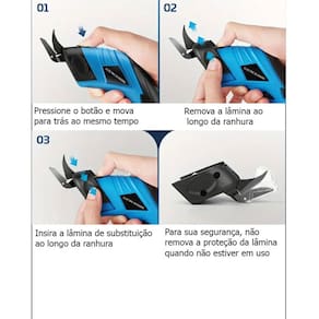 Com lâminas fáceis de instalar, você pode completar qualquer tarefa diária, tarefa de bricolage em casa ou projeto de artesanato sem esforço com as tesouras de papelão. A lâmina de tecido cortará couro sintético, feltro, papel e tecido. Design ergonômico - O design em forma ergonômica permite um corte mais preciso sempre que as tesouras sem fio são usadas. Com a lâmina de materiais duros, as tesouras elétricas cortarão papelão e embalagens. Esta tesoura de corte de tecido permitem que você leve seus projetos em qualquer lugar e eliminam cabos bagunçados. Com operação sem fio e uma trava de segurança para evitar uso acidental, este cortador de tecido elétrico é simples de usar. Possui tampa para a lâmina, para deixar quando não estiver em uso.