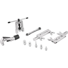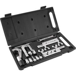 1 jogo de cortador e flangeador de tubos com 11 peças, sendo: 1 maleta plástica, 1 flangeador, 1 cortador, 5 acessórios para alargar tubos, 2 bases de fixação dos tubos e 1 chave catraca