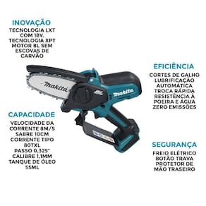Dados técnicos: Plataforma: lxt; Bateria: 18v; Velocidade da corrente: 8 m/s; Sabre: 10 cm; Corrente: -tipo: 80 txl; -passo: 0,325; -calibre: 1,1 mm; Capacidade tanque de óleo: 55 ml; Peso: 2,0 kg.
