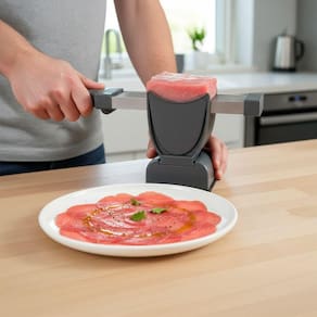 carpaccio com cortes uniformes. Possui lâmina em aço inox de alta