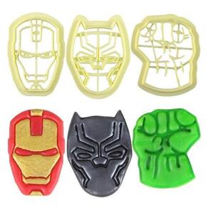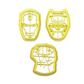 Kit cortadores heróis mod.3. Perfeito para decorações com tema de heróis, são três opções diferentes: capacete do Homem de ferro, punho do Hulk e capacete do Pantera negra. Faça lindos apliques para seus doces, bolos, tortas, lembrancinhas e decorações, surpreenda seus clientes e eleve o nível de seus trabalhos com o corte preciso e acabamento profissional que esses cortadores atribuem.
