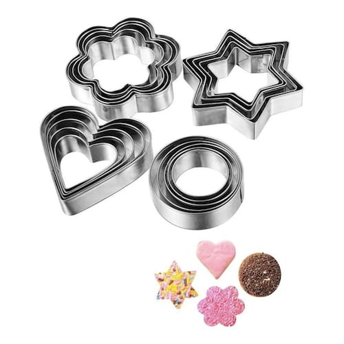 12 cortadores de biscoitos com diferentes desenhos - Cor: prata. - Material: aço inoxidável. Formulários: - 3 círculos. Medidas: 3,2 cm de diâmetro.4, 2cm de diâmetro.5cm de diâmetro.- 3 flores. Medidas: 3,7 cm, 5 cm, 6,5 cm.- 3 estrelas: 3 cm, 5 cm, 6,5 cm.- 3 corações. Medidas: 3,7 cm x 4 cm. 4,2 cm x 4,5 cm. 5,9 cm x 5 cm.- Material: aço inoxidável.- Ideal para cortar massa de biscoito, massa de fondant e argila artesanal. As crianças gostam de jogos divertidos.\ n-Fácil de usar e limpar.\ n para fazer biscoitos, chocolate, etc.\ n-Belo design.\ n-Decore seus biscoitos ou bolos. O pacote inclui\ n-x12 peças de moldes para biscoitos.