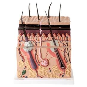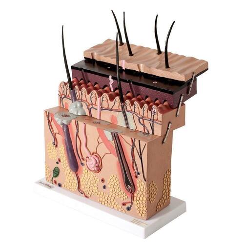 Modelo anatômico de corte de pele ampliado, apresentando as estruturas da pele (pele, derme, epiderme, etc.) em camadas. Confeccionado em resina plástica emborracha.