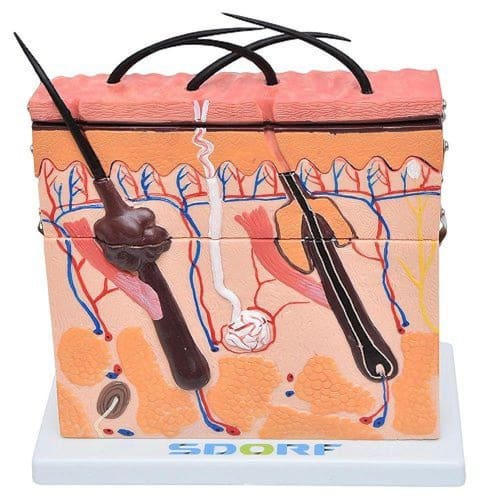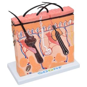 Modelo anatômico de pele ampliada em camada, confeccionado em PVC, é um modelo que possibilita a visualização de forma detalhada de todas as camadas da pele, Apresenta um dispositivo que possibilita demonstrar as camadas da pele. O modelo SD-5054 apresenta as seguintes estruturas entre outras:
