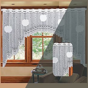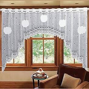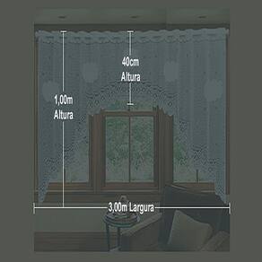 Tamanho: 1,00 x 0,40 x 3,00m (altura x altura centro x largura) Tecido: Renda com Estampa Categoria: 100% Poliéster Ambiente: Cozinha Ilhós: SEM Ilhós - Cortina Passa Varão Luminosidade: Permite luminosidade Sugestão: Varão tubular de 9 mm Lavagem: A mão com tecido macio e úmido e secagem à sombra Notas: Imagem ilustrativa | Também Vendido a Metro
