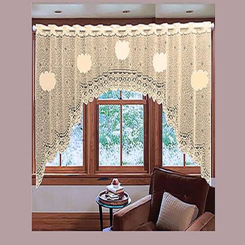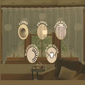 Tamanho: 1,00 x 0,40 x 3,00m (altura x altura centro x largura) Tecido: Renda com Estampa Categoria: 100% Poliéster Ambiente: Cozinha Ilhós: SEM Ilhós - Cortina Passa Varão Luminosidade: Permite luminosidade Sugestão: Varão tubular de 9 mm Lavagem: A mão com tecido macio e úmido e secagem à sombra Notas: Imagem ilustrativa | Também Vendido a Metro