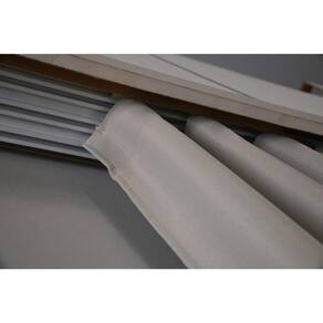 A cortina é dividida em duas partes, podendo ser aberta ao meio de forma prática e funcional. Cada parte possui 3,50 metros de largura esticada, garantindo uma cobertura completa da janela.
