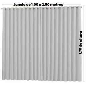 Com uma altura de 1,70 metros, ela é versátil e se adapta perfeitamente a janelas que variam de 1,00 metro até 2,50 metros, proporcionando uma cobertura eficaz e elegante. Seus 32 ilhós quadrados e cromados não apenas adicionam um toque de sofisticação, mas também garantem uma instalação fácil e durável.