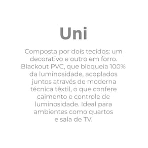 Transforme seu ambiente em um espaço sofisticado e elegante com a cortina Uni Rubi! Composta por um tecido 100% poliéster e um forro de pvc, as duas partes são acopladas deixando a cortina mais harmônica e elegante. Com bloqueio de 100% da luminosidade a Cortina Uni Rubi é uma opção elegante e discreta ao mesmo tempo, a opção perfeita para a sua casa. Contém duas partes de 1,30m de largura e 1,70m de altura, com 16 ilhoses. Não acompanha varão, imagens ilustrativas.