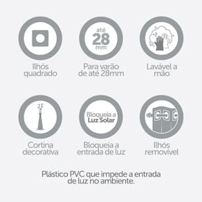 As principais vantagens dessa cortina são o seu poder de cortar a luz em 100%, seu tecido em PVC, que é fácil de lavar e instalar, além de proporcionar privacidade e permitir o controle da luminosidade do ambiente. O conteúdo da embalagem inclui 01 Cortina blackout PVC 2,20m x 1,30m.