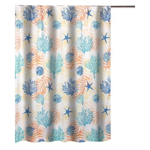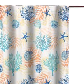Cortina de chuveiro Benjara Geo de 72 polegadas, poliéster branco azul, estampa de conchas marinhas e samambaias