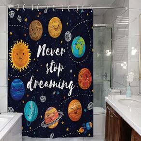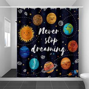 Tamanho da cortina de chuveiro: 180* 180 cm Peso: 400 g Material: poliéster Cor: igual à primeira foto Embalagem: 1 x cortina de chuveiro Design divertido e colorido: com um sistema solar divertido em estilo de desenho animado com planetas, luas e estrelas, esta cortina de chuveiro inspira as crianças com a mensagem “Nunca pare de sonhar”, tornando a hora do banho divertida e educativa. Poliéster de alta qualidade: feita de poliéster durável e impermeável, esta cortina de chuveiro foi projetada para suportar o uso diário, mantendo a água no chuveiro e fora do banheiro. Perfeito para banheiros infantis: as cores vibrantes e o design extravagante o tornam a escolha ideal para um banheiro infantil ou decoração com tema espacial, adicionando emoção e criatividade ao espaço. Fácil de limpar e manter: lavável à máquina e fácil de pendurar, esta cortina de chuveiro garante um cuidado descomplicado, mantendo suas cores vivas e seu design divertido. Tamanho ideal e versátil: medindo 180x180 cm, ele se encaixa na maioria dos chuveiros e banheiras padrão, fornecendo a cobertura perfeita para o banheiro do seu filho e transformando-o em um espaço divertido.