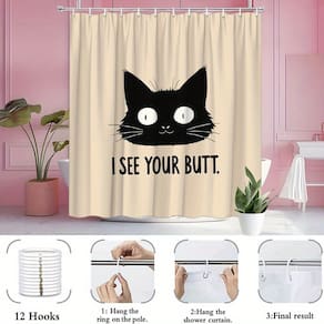 Tamanho da cortina de chuveiro: 180* 200 cm Peso: 410 g Material: poliéster Cor: igual à primeira foto Pacote: 1 x cortina de chuveiro Obra de arte Playful Cat: apresenta uma ilustração ousada de gato preto com letras engraçadas que adicionam um toque divertido e alegre à decoração do seu banheiro. Tecido de poliéster durável: feito de poliéster macio e resistente que mantém estampas nítidas e resiste ao desbotamento durante o uso diário. Impermeável e fácil de manter: o tecido revestido repele a umidade, seca rapidamente e ajuda a manter seu banheiro limpo e fresco. Instalação simples: projetado para varões de chuveiro padrão e inclui ganchos para suspensão rápida e fácil. Estilo decorativo moderno: perfeito para banheiros domésticos, apartamentos, dormitórios ou espaços para hóspedes — traz um toque peculiar e moderno a qualquer ambiente.