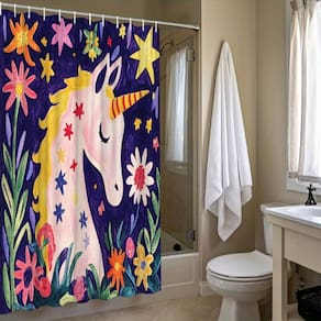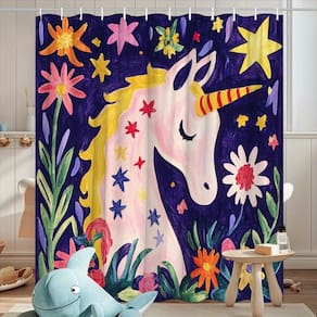 Tamanho da cortina de chuveiro: 180* 200 cm Peso: 410 g Material: poliéster Cor: unicórnio Embalagem: 1 x cortina de chuveiro Magical Unicorn & Floral Art — Apresenta um unicórnio sonhador cercado por flores e estrelas vibrantes, criando um ponto focal caprichoso e colorido perfeito para banheiros infantis ou decoração inspirada na fantasia. Tecido de poliéster durável — Feito de poliéster de alta qualidade que resiste a rugas e oferece um toque suave, preservando obras de arte brilhantes e detalhadas. Impermeável e de secagem rápida — Revestido para repelir a umidade e reduzir respingos, ajudando a manter um ambiente de banheiro seco e arrumado durante o uso diário. Fácil instalação com ganchos — Inclui 12 ganchos fortes compatíveis com a maioria dos varões de chuveiro padrão, garantindo uma configuração rápida e uma suspensão estável. Cuidados laváveis na máquina — Suporta uma lavagem suave na máquina para manter a cortina limpa e vibrante, prolongando sua vida útil geral.