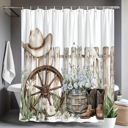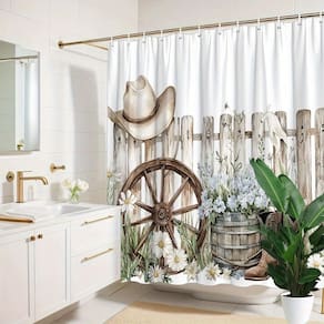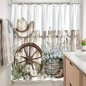 Tamanho da cortina de chuveiro: 180* 180 cm Peso: 380 g Material: poliéster Cor: igual à primeira foto Pacote: 1 x cortina de chuveiro Tecido de poliéster de alta qualidade — Feita de poliéster durável e resistente à água, esta cortina de chuveiro foi projetada para manter suas cores vibrantes e suportar o uso diário em seu banheiro. Design rústico ocidental — apresenta um charmoso tema country ocidental com uma roda de carroça de madeira, botas de cowboy e flores silvestres, adicionando um toque rústico à decoração do seu banheiro. Impermeável e de fácil manutenção — O material impermeável mantém o piso do banheiro seco, enquanto a cortina é lavável à máquina para facilitar o cuidado e o uso duradouro. Perfeito para o estilo de fazenda rural — Ideal para quem deseja aprimorar um banheiro com tema campestre ou de fazenda, criando uma atmosfera calorosa e convidativa com um toque ocidental. Tamanho generoso e uso versátil — A cortina mede 180 x 180 cm, se encaixa na maioria dos tamanhos padrão de chuveiro e funciona bem com outros acessórios de banheiro rústicos ou de fazenda.
