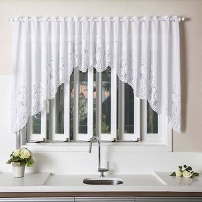 Seus detalhes técnicos são: - Contém uma cortina estilo cascata. - Estampa de tulipinhas. - Material: renda branca. - Medidas: largura de 2,00m e altura de 1,00m. - Consumo de tecido: largura de 3,00m e altura de 1,00m. - Indicado para varões de até 2,00m de largura. - Não acompanha varão.