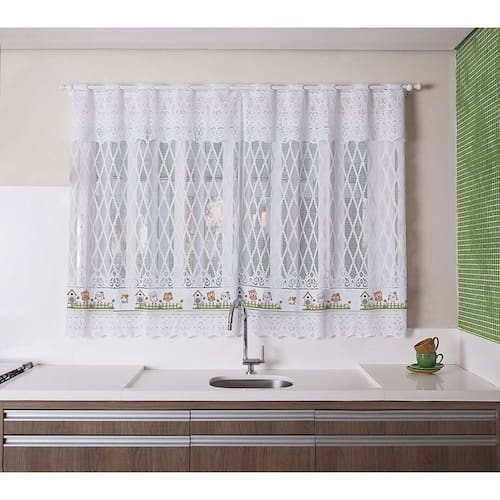 - Cortina de Renda linha Copa e Cozinha - Composição: 100% Poliéster - Dimensões: 2,00m de largura x 1,20m de altura + 0,30m de bando - Contém: 1 Cortina de Renda Para Varão - Marca: Interlar Indicado para janelas no tamanho: de 1,20m até 1,80m de largura. Ean: 7892774401816
