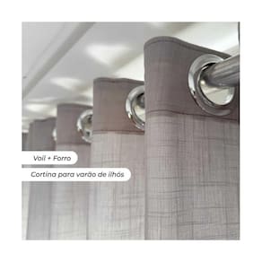 Praticidade e elegância: O design com ilhoses cromados facilita a instalação e oferece durabilidade, enquanto o caimento fluido cria um ambiente leve e sofisticado.