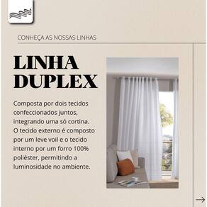 A Cortina Duplex Mônaco possui linho flamê decorativo e forro. Os dois tecidos são presos no mesmo ilhós, formando uma só cortina, com ótimo caimento e acabamento.