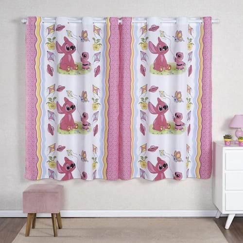 Cortina Infantil 2,00 x 1,60 Quarto Brinquedoteca Menino Menina Personagens Cor: Stitch rosa Nossas cortinas de personagens vão deixar o quarto dos seus filhos muito mais divertidos e aconchegantes