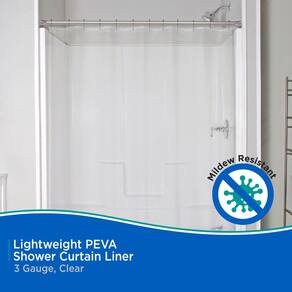 Forro de cortina de ducha Kenney KN61433, ligero, de 3 calibres, impermeable, hecho de PEVA libre de PVC, respetuoso con el medio ambiente y sin olor. Cuenta con ojales reforzados que evitan desgarros causados por ganchos y argollas, y un dobladillo inferior con peso magnético para mantener el forro en su lugar y el agua donde debe estar. Tamaño estándar que se adapta a la mayoría de las bañeras y duchas: 180 cm de ancho por 183 cm de alto. Color transparente. Presentación de 1 unidad.