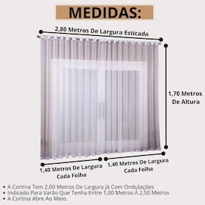 --- medidas: 2,00m de largura x 1,70m de altura. --- a cortina tem 2,00 metros de largura já com ondulações já franzida . --- a cortina tem 2,80 metros de largura esticada de consumo . --- indicado para varão que tenha entre 1,00 metros á 2,50 metros. --- para varão simples não acompanha varão . --- serve em varão de todos os tipos e grossuras. --- a cortina é translúcida quase transparente . --- é apenas de voil sem forro . --- com ilhós cromado. --- com as costuras super resistentes e reforçadas. --- ideal para casas, igrejas, eventos, etc. --- são duas folhas cada folha tem 1,40m x 1,70m . --- a cortina abre ao meio. --- nome do tecido: voil voal . --- composição: 100% poliéster. --- contém na embalagem: 01 - cortina de voil 2,00m x 1,70m. ---------- Refinada casa --- temos a reputação verde escuro 100% dos clientes satisfeitos . --- produto com excelentes avaliações pelos nossos clientes produto de qualidade e bem acabado . --- atendimento especializado para resolver qualquer problema ou tirar dúvidas. do vendedor: 7 dias Marca: Não Informado Ean: 79011049939572