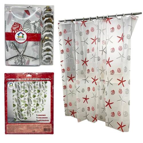 Contém na embalagem 01 cortina para box banheiro com ganchos 100% poliester 180cm