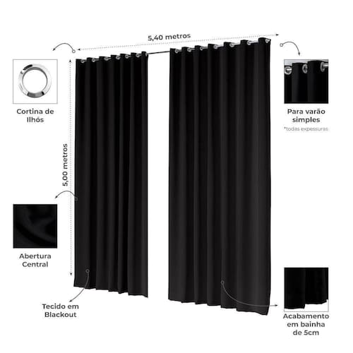 Cortina pé direito duplo 5,40x5,00m preto Cortina solaris 5,40m x 5,00m contém na embalagem: 01 cortina de 5,40 metros largura x 5,00 metros de altura medida da cortina esticada Características: cortina longa para pé direito duplo ideal para varão simples de 4m Tecido blackout avesso todo preto Não acompanha varão Detalhe de acabamento em ilhós Medida total de 5,40m de largura esticada cortina dividida 2 partes, ou seja, pode ser aberta ao meio Produto não é plástico pvc , é tecido Cortina não é 100% blackout, veda aproximadamente 70% Cada parte da cortina possui 2,70m esticada Tecido blackout Composição 100% poliéster Obs: por conta de acabamento, poderá haver variação de 2 a 3 centímetros na altura da cortina, dependendo do lote de tecido Marca: Sofisticada Moda Casa