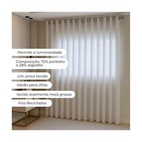 Transforme sua casa com a elegância da Cortina Rústica Lugo! Feita com fios reciclados para uma escolha sustentável. Seu tecido é levemente mais grosso com uma gramatura de 221,46g/m, é composto por 72% poliéster e 28% algodão, garantindo durabilidade e charme. Desenvolvida para permitir a entrada de luz natural sem comprometer sua privacidade, a Cortina Rústica Lugo possui bainhas laterais de 2cm e uma barra inferior de 5cm. Com duas folhas de 2,10m, sua largura total de 4,20m por 2,50m de altura é ideal para salas e espaços onde a luminosidade é bem-vinda. Esta cortina é compatível com varões de até 2,00m de largura e apresenta 28 ilhoses cromados para uma instalação fácil e elegante. Adquira agora a sua Cortina Rústica Lugo e dê um toque moderno com um toque clássico ao seu ambiente. Imagens meramente ilustrativas. Varão não incluso.
