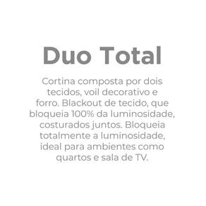 Requintada e cheia de charme, a cortina duo é composta por um voil decorativo no tecido bellini e um blackout de tecido que bloqueia 100% a luminosidade, apresentando sofisticação e beleza em seu lar, podendo utilizar em seu quarto, sala ou escritório. A cortina Duo total tem o benefício de diminuir a temperatura dentro da sua residência, controle de acústico e privacidade para a sua família. O forro frente e verso 100% poliéster e tecido interno 100% Poliamida e o Voil 100% poliéster propondo um estilo contemporâneo e com o toque liso, possui 2 partes de 2,10m de largura por 2,50m de altura com acabamento na bainha lateral e barra na parte inferior. Indicado para varão de 2,00M com 28 ilhoses. Fotos ilustrativas, não acompanha o varão.