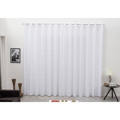 Jacquard é um dos preferidos na hora de dar um toque moderno, isso porque os desenhos formados conferem charme e personalidade ao ambiente, além de serem fáceis de combinar, conferindo sofisticação e muito estilo. Medidas Prontas: Largura 2,80m x Altura 1,30m Dividida em 2 partes de 1,40m x 1,30m Tecido: Jacquard / 100% Poliéster Cor: Branco Acabamento feito na Bainha Ilhós Cromado, indicado para Varão de 28mm Cortina ideal para Varão de até 2m Não acompanha o Varão Marca: Não Informado