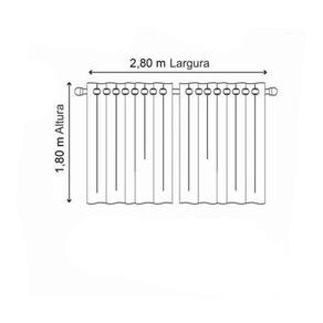 Consumo de tecido: 3,00 metros x 1,80 metros Medidas prontas: largura 2,80 metros x altura 1,80 metros Quantidade de folhas: 2 folhas de 1,50 metros de largura x 1,80 metros altura Recomendável para varão simples de 2,00 metros a 2,50 metros com até 30 mm. Cor do ilhós: branco Cortina com ilhós para varão simples Não acompanha varão.