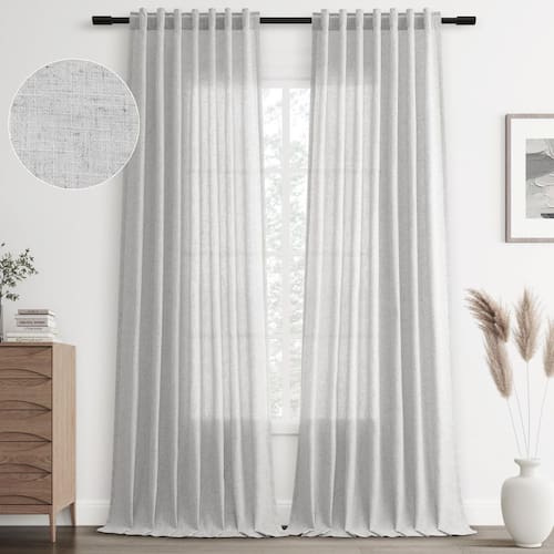 Cortinas de linho com aba traseira - Mistura de linho natural e extramacia: feitas de uma mistura de linho natural e tecido de poliéster, nossas cortinas de janela exibem uma aparência delicada e natural e uma vibração confortável e aconchegante. A superfície texturizada de linho adiciona fascínio visual e um toque de elegância - 3 opções de suspensão: 1. Use abas traseiras para obter uma sensação casual moderna; 2. Use o bolso da haste para um visual clássico; 3. Use anéis de clipe para facilitar o deslizamento (clipes e anéis não estão incluídos). - Pacotes: Conjunto de 2 painéis em 1 pacote. Cada painel mede 132 cm de largura por 274 cm de comprimento, total de 264 cm de largura. Disponível em e comprimentos, nossas cortinas de linho se adaptam sem esforço às suas preferências de decoração neutra, você pode facilmente misturar essas cortinas de linho com o seu enfeite de janela existente na sala de estar e cozinha. quarto, banheiro, lavanderia, pátio, palitinho, marquise, sala de teto alto ao chão, escritório em casa, etc - Luz solar suave e privacidade: Brilho suavemente difuso e a quantidade certa de luz solar intensa, permitindo que uma brisa suave permeie seu espaço, cortinas de linho em tons neutros garantem um grau de privacidade. O tecido semitransparente protege a visão interna, permitindo que você aproveite seu espaço enquanto protege seus momentos privados do escrutínio externo - Manutenção sem esforço e estilo atemporal: lave facilmente em água fria, seque em temperatura baixa e passe a ferro na configuração mais suave, se necessário.