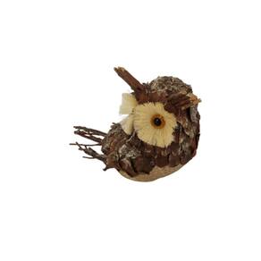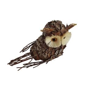 Coruja Decorativa estrutura em EPS revestida com cascas e gravetos naturais.