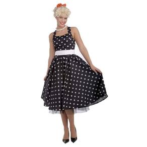 Esta fantasia feminina dos anos 50 inclui um lindo vestido de bolinhas, crinolina e cinto. Escolha seu vestido dos anos 50 em azul, preto ou vermelho. Cada um é vendido separadamente. As roupas dos anos 50 vêm em tamanhos adultos XS/Small, GG, Médio/Large, Plus Size e Standard. As luvas, o capacete e as joias não estão incluídos no traje de baile feminino dos anos 50.