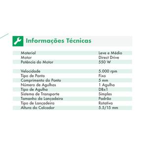 - Material Leve e Médio - Motor Direct Drive - Regulagem de velocidade - Potência do Motor 550 W - Tensão 220 v - Velocidade 5.000 rpm - Tipo de Ponto Fixo - Comprimento do Ponto 5 mm - Número de Agulhas 1 Agulha - Tipo de Agulha DBx1 - Luz de leed - Sistema de Transporte simples - Tamanho da Lançadeira Padrão - Tipo de Lançadeira Rotativa - Altura do Calcador 5.5/15 mm - Maquina enviada com pés e mesa desmontados via transportadora Montagem por conta do Comprador