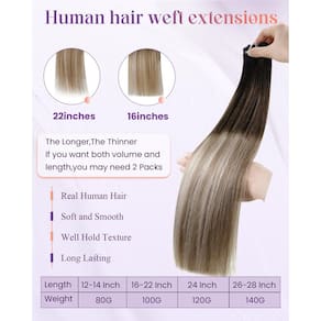 Extensões de cabelo de costura LaaVoo aprimoradas, cabelo humano real! Por que você precisa de extensões de cabelo humano de trama? ?A trama do cabelo humano é segura e versátil para lidar com baixa densidade ou para fazer uma peruca completa ou para adicionar comprimento/volume. ?Estas extensões de trama de cabelo ombre/balayage são as mais razoáveis para obter uma combinação de cor perfeita sem danificar seu próprio cabelo. ?Se você é um usuário de extensão ou cosmetologista, você deve ter passado por cabelos caros ou fora da marca. E a marca "LaaVoo" traz a você extensões de trama de cabelo de qualidade e acessíveis. ?As extensões de trama de cabelo costuradas não contêm nenhuma peça de fixação, você pode costurar, colocar micro ligação, prender ou colar como quiser. ?Normalmente, 2-3 conjuntos são suficientes para uma cabeça inteira. Especificações: Material do cabelo: Cabelo humano real Textura do cabelo: Liso natural Cor do cabelo: Mais de 10 cores disponíveis Comprimento do cabelo: 30-61 cm Peso do cabelo: (30,5 cm/35,5 cm): 80 gramas/feixe; (40,6 cm/45,7 cm/50,8 cm/55,9 cm/61 cm): 100 gramas/pacote Vida útil do cabelo: Depende muito de como eles foram utilizados e cuidados Como lavar e costurar extensões de cabelo de trama? Penteie as extensões de cabelo antes de lavar. Lave as extensões de cabelo em água morna suavemente, use um pouco de xampu suave e condicionador sem sulfato. Segure suavemente as extensões de cabelo e esprema a água, depois seque as extensões de cabelo com uma toalha e deixe secar naturalmente. - Motivo para escolher um cabelo de trama: o cabelo de trama LaaVoo é feito de cabelo humano remy e usa tecnologia avançada de tingimento para criar uma textura macia e suave, assim como o seu próprio cabelo. Pode ser amarrado ao seu cabelo firmemente - Como evitar queda ou emaranhamento: antes de lavar, escove o cabelo com um pente de dentes largos suavemente, use xampu suave e condicionador sem sulfato e óleo e máscara capilar pelo menos uma ou duas vezes por semana - Várias formas de uso e larguras: o cabelo de trama LaaVoo pode ser costurado diretamente, com clipe ou micromiçangas. Mas a cola não é recomendada porque pode ser prejudicial ao seu cabelo. Pode ser cortado em qualquer largura que você quiser para atender às suas necessidades especiais de bricolage - Especificação especial do produto: as extensões de cabelo de trama LaaVoo têm 80 g para 30.5-35.6 cm, 100 g para 40.6-56 cm e 120 g para 61.0 cm. Além disso, existem opções de 140 g de 66 cm e 71 cm para a cor 1. Tramas duplas fornecem robustez e durabilidade - Atende às suas necessidades especiais: o cabelo de trama LaaVoo tem bonitas que podem ser enroladas abaixo de 180 °C. Diferenças de cor podem ocorrer ocasionalmente devido a fatores de luz. Se ainda estiver confuso sobre a cor, consulte a equipe de atendimento ao cliente