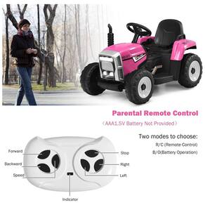 Dois modos de controle 1. Modo de controle remoto dos pais Os pais podem controlar sem esforço este carrinho de brinquedo com o controle remoto fornecido, que promove a interação entre pais e filhos. 2. Modo de operação a bateria alimentado por bateria recarregável, este trator elétrico permite que as crianças o controlem livremente com o volante e o pedal dentro.