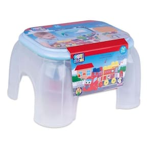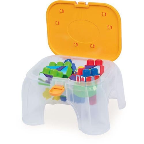Um brinquedo super legal. Quando fechado ele vira um banquinho para os baixinhos sentar, pode ser levado para onde quiser, muito leve. No próprio banquinho pode ser guardada as peças do brinquedo. Todas as peças possuem encaixes. Vem com adesivos para os pequenos decorar o brinquedo.