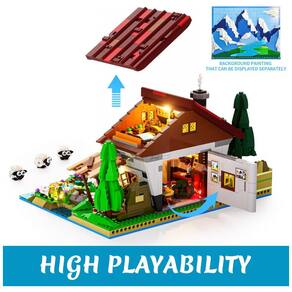 Conjunto de blocos de montar em plástico que representa uma casa de pastor alpino em pedra com curral de ovelhas, riacho e fundo de paisagem montanhosa modular em 3D. O cenário pode ser exposto com o diorama de fundo acoplado à casa ou separado, mantendo acabamento completo nas duas configurações.?